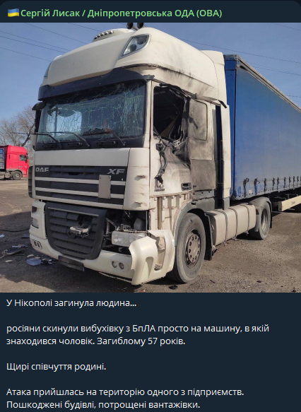"Под Никополем погиб человек...Россияне просто сбросили взрывчатку с БПЛА на машину, в которой находился человек. Погибшему 57 лет", - сообщил Лысак.