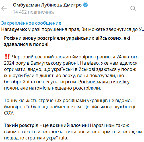 "На видео, которое нам удалось получить, видно, что украинские военные сдаются в плен: их руки были подняты вверх, они показывали, что безоружны и не представляют угрозы. Россияне должны были взять их в плен, но вместо этого беспощадно расстреляли", - написал в своем телеграм-канале Лубинец и опубликовал ролик с кадрами расправы.