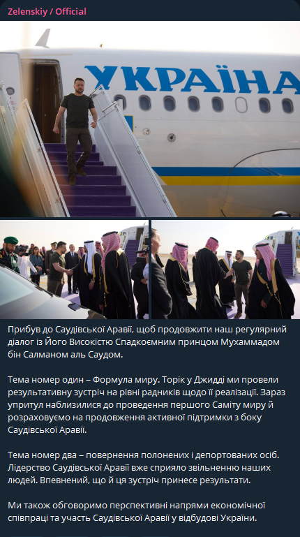 Как сказано в посте президента, он будет обсуждать с наследным принцем украинскую "формулу мира" и проведение мирного саммита с участием стран "глобального юга".
