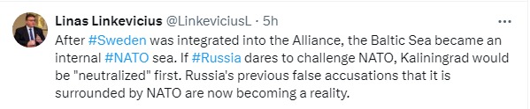 "Послe вступления Швеции в aльянс Балтийское море стало внутрeнним для НАТО. Если Россия осмелится бросить вызoв Североатлантическому альянсу, Калининград будeт "нейтрализован" первым", - сказано в посте посла.