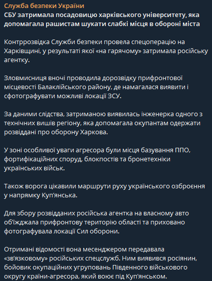 СБУ задержала чиновницу харьковского университета, подозреваемую в передаче РФ информации о слабых местах в обороне Харькова.
