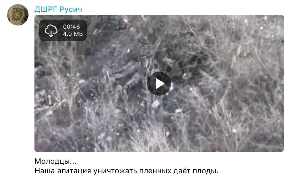 "Наша агитация уничтожать пленных даёт плоды", - сказано в телеграм-канале "Русича" под видео одного из расстрелов.
