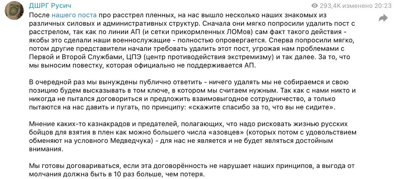 Позже в "Русиче" написали, что на группировку вышли "несколько наших знакомых из различных силовых и административных структур" и попросили удалить пост о расстреле пленных.