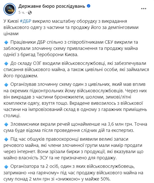 "Организовал преступную схему один из гражданских, оказывавший влияние на отдельных подконтрольных ему военнослужащих. Через них он похищал из части бронежилеты, шлемы, зимние/летние комплекты одежды, обуви и т.д. Украденное вывозилось из воинской части на импровизированный склад в одном из гаражных помещений столицы", - говорится в сообщении.