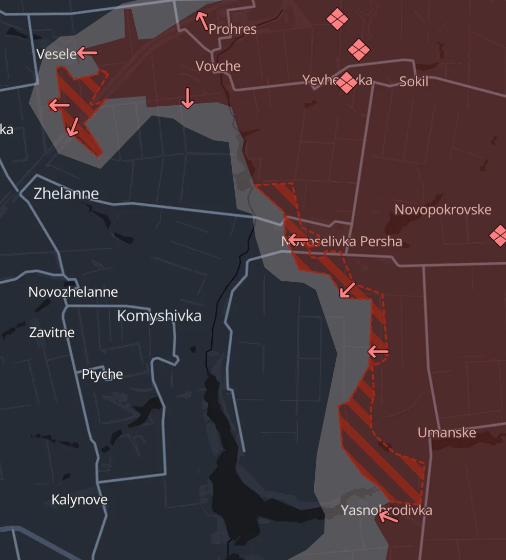 От Волчьего они атакуют в сторону Веселого и Желанного, также они прошли вперед широким фронтом от Новоселовки Первой до Яснобродовки, где продвижение идет вторые сутки.