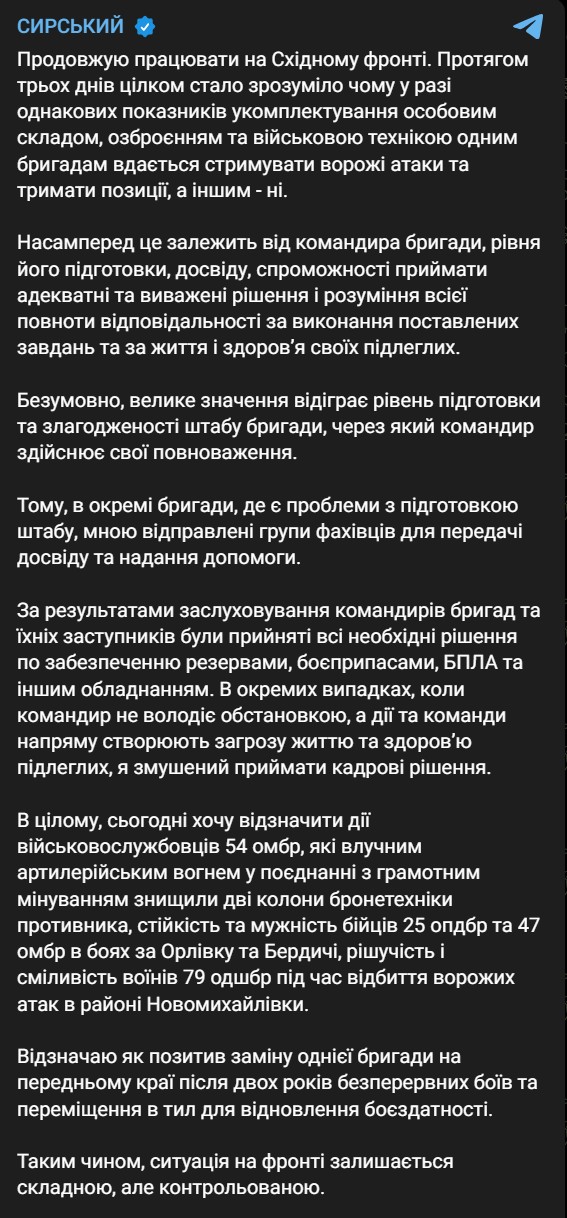 Главнокомандующий ВСУ Александр Сырский анонсировал увольнения командиров бригад на восточном фронте.