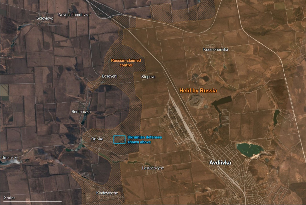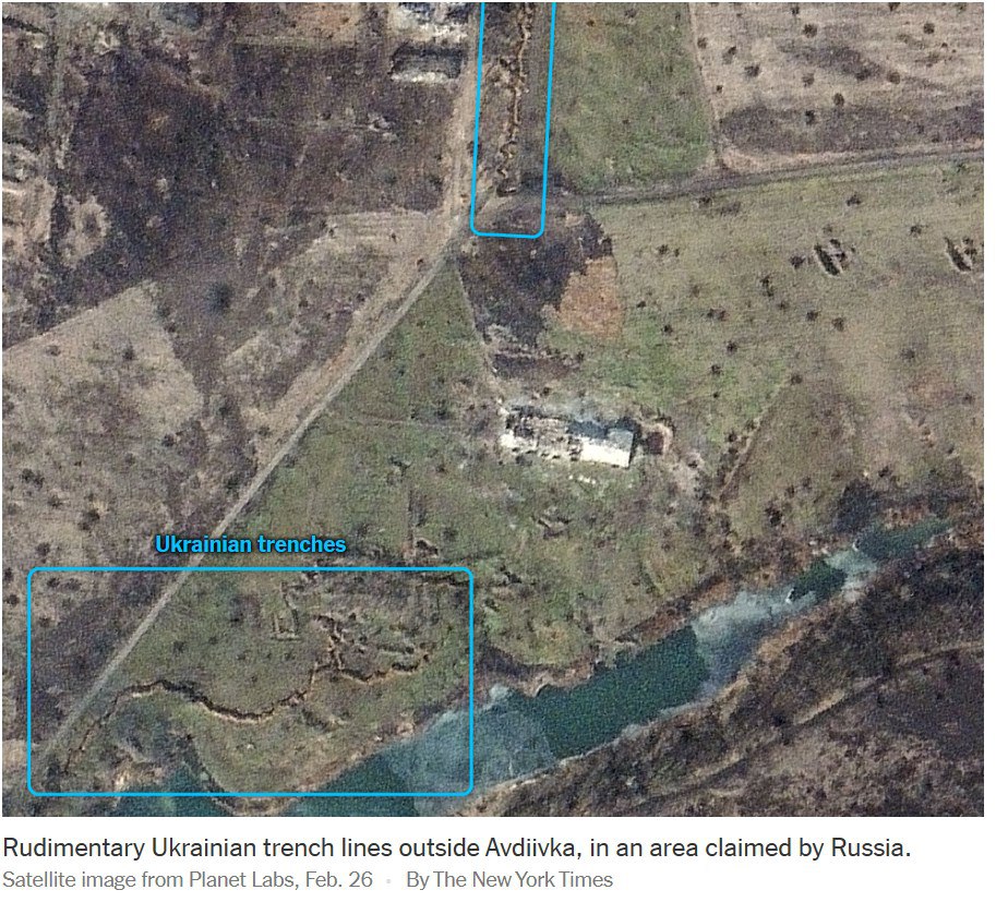 New York Times написала об "удивительно слабой" обороне Украины к западу от Авдеевки. Издание публикует спутниковые снимки украинских укреплений, которые называет "редкими" и "элементарными".