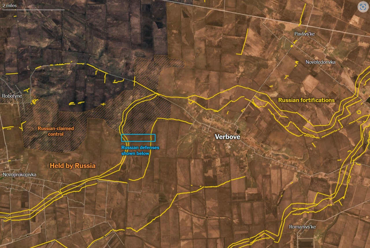 "Вербовое имеет концентрическое кольцо укреплений. Оно начинается с траншеи, достаточно широкой, чтобы заманить в ловушку наступающие танки и бронетехнику, за которой следует сеть цементных препятствий, известных как зубы дракона, которые также используются для остановки транспортных средств, и, наконец, обширная траншея для пехоты", - сообщает издание.