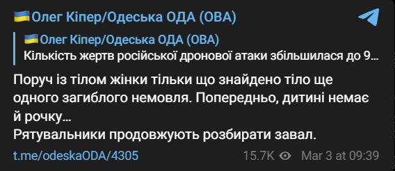 Напомним, вчера во время ночной атаки беспилотников в Одессе в многоэтажный дом попал сбитый "Шахед", в результате чего полностью разрушился один подъезд.