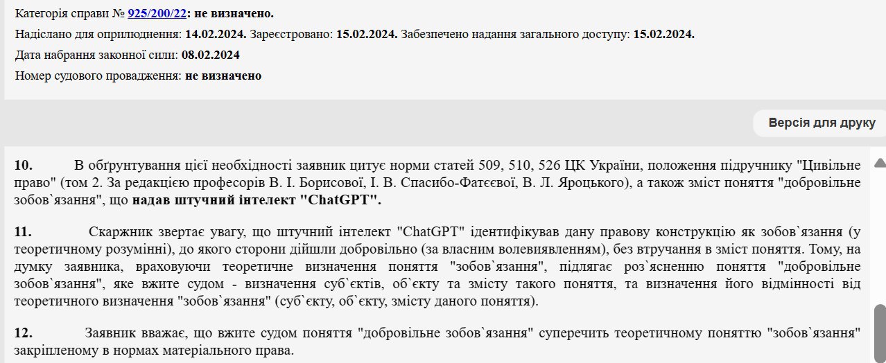 Адвокат по одному из дел обратился к судьям, чтобы они разъяснили принятое ими решение. И сослался на толкование, сделанное ChatGPT, который счел неверным употребленное судом понятие "добровольное обязательство". По мнению ИИ, оно "противоречит теоретическому понятию, закрепленному в нормах материального права".