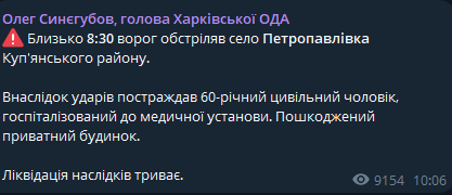 Сегодня утром российские военные атаковали село Петропавловка Купянского района. В результате обстрела пострадал мужчина.