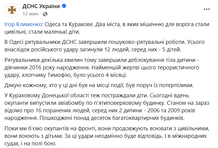 "В Одессе спасатели ГСЧС завершили поисково-спасательные работы. Всего в результате российского удара погибли 12 человек, среди них – 5 детей. Спасатели несколько минут назад завершили деблокирование тела ребенка – девочки 2016 года рождения. Младшей жертве этого террористического удара, мальчику Тимофею, было всего 4 месяца", - говорится в сообщении.