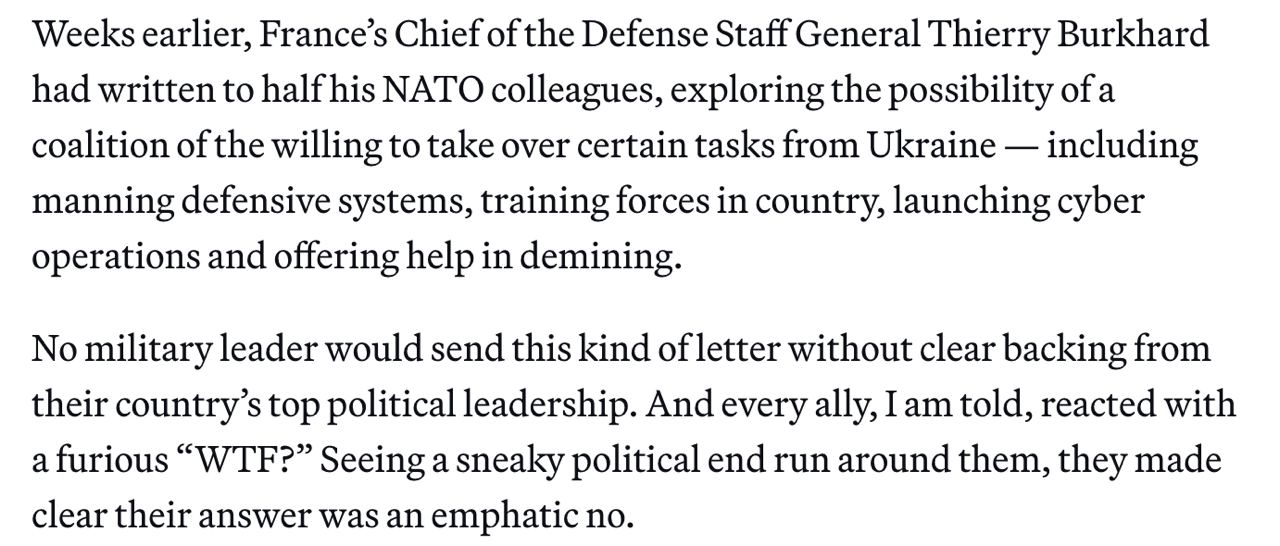 11.22 Начальник штаба обороны Франции Тьерри Буркхард несколько недель назад написал коллегам по НАТО с вопросом о возможности отправки иностранных военных в Украину для выполнения ряда задач, утверждает бывший постпред США при НАТО Иво Даалдер в статье для Politico.