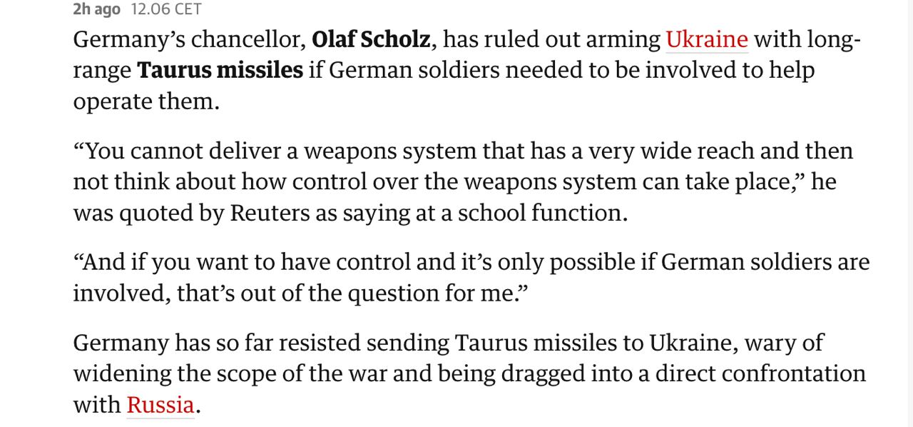 14.44 Шольц снова высказался против поставок Украине ракет Taurus, если их применение требует участия немецких военных, передает The Guardian.