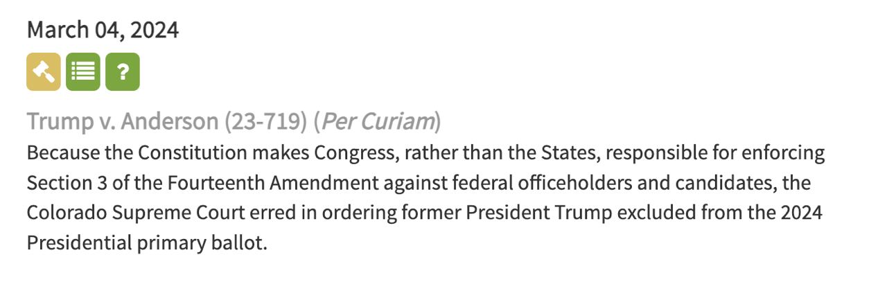 Таким образом было отклонено решение судьи штата Колорадо, который исключил Трампа из республиканских праймериз, потому что он принимал участие в "мятеже или восстании".