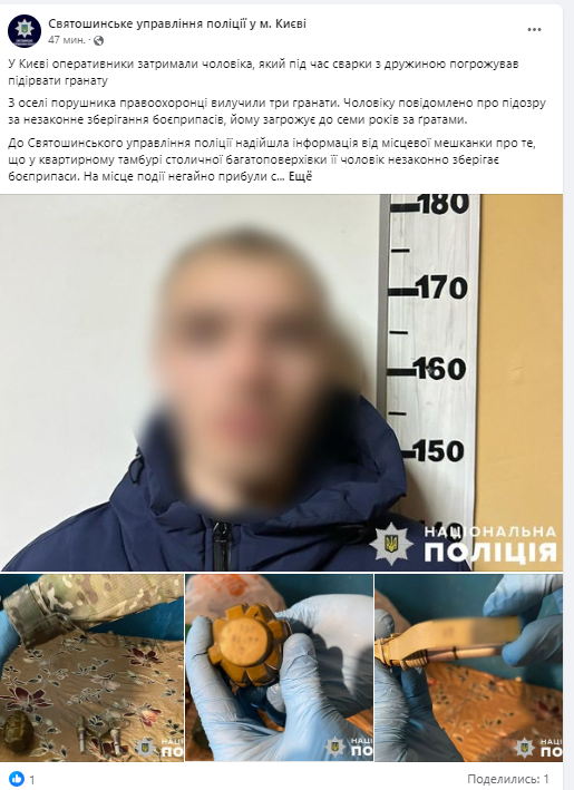 В Киеве мужчина угрожал взорвать гранату в квартире во время ссоры с женой. Его задержали и нашли в квартире три гранаты.