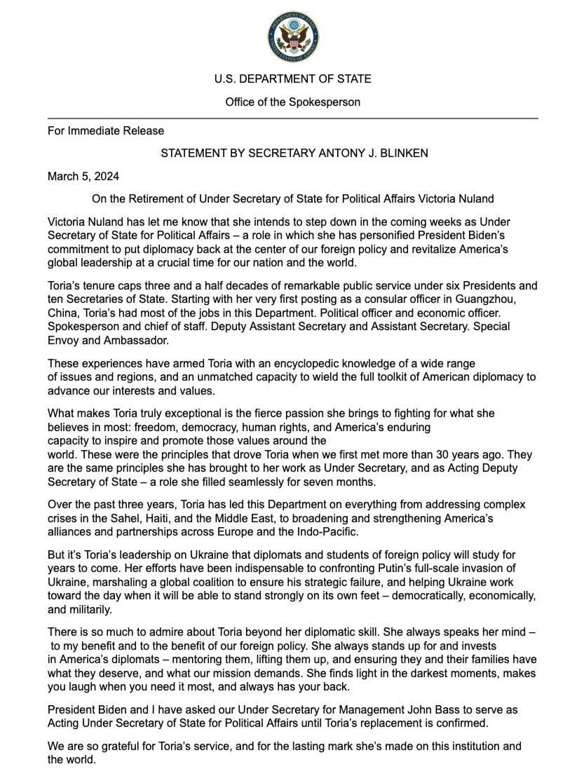 "Виктория Нуланд сообщила мне, что в ближайшие недели намерена покинуть пост заместителя госсекретаря по политическим делам - роль, в которой она олицетворяла стремление президента Байдена вернуть дипломатии центральное положение в нашей внешней политике и возродить глобальное лидерство Америки в критическое время для нашей страны и всего мира", - говорится в письменном заявлении Блинкена, распространенном пресс-службой Госдепартамента.