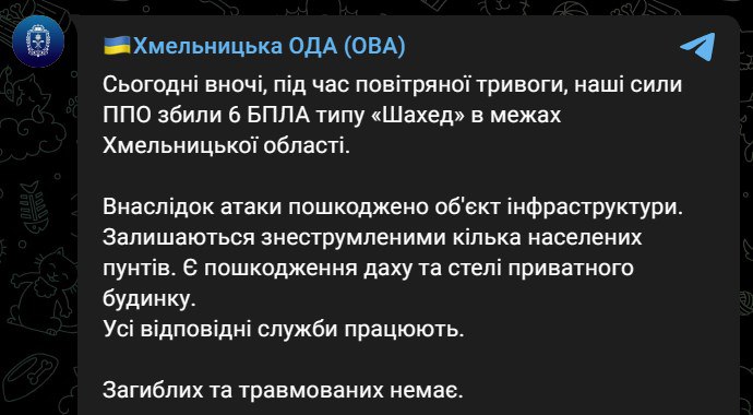 08.52 Ночью "Шахед" ударил по объекту инфраструктуры в Хмельницкой области. Часть населенных пунктов региона обесточены.