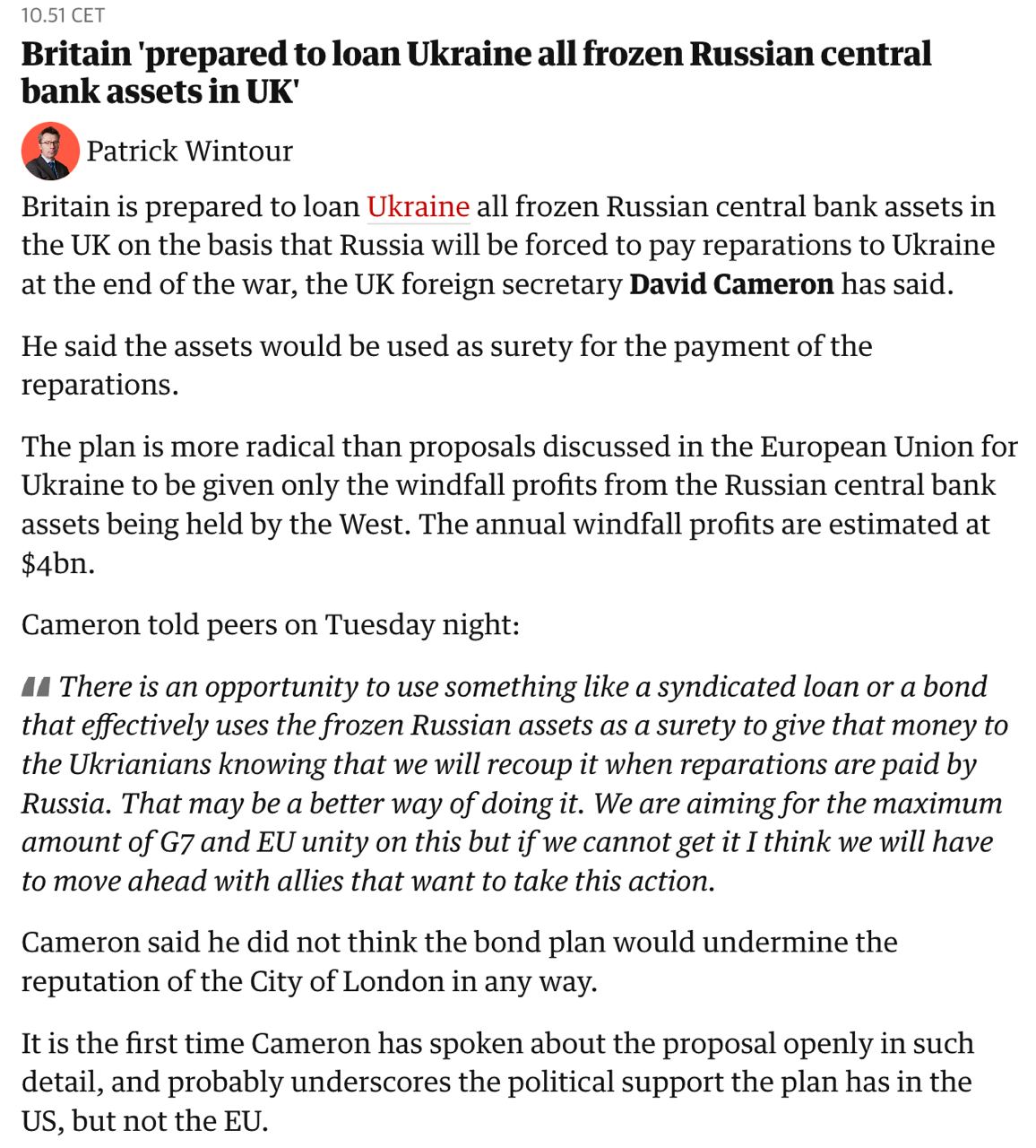 15:02 Британия готова предоставить Украине все замороженные активы российского центрального банка на своей территории, приводит слова министра иностранных дел Дэвида Кэмерона The Guardian.