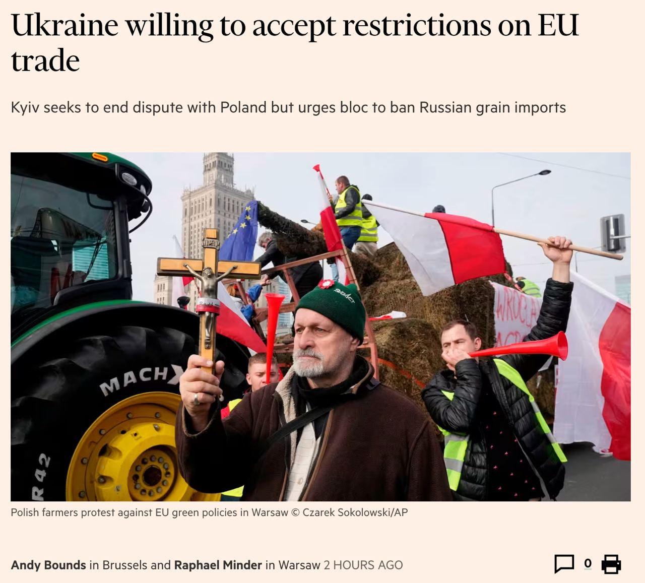"Может быть, для переходного периода такого рода. . . управляемый подход к торговым потокам между Украиной и ЕС – это то, что нам всем нужно. Что касается пшеницы, то не Украина создает проблемы для польских фермеров, а Россия", - заявил Качка.