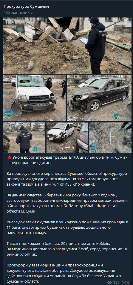 Прокуратура публикует фото последствий сегодняшней атаки РФ по Сумам.