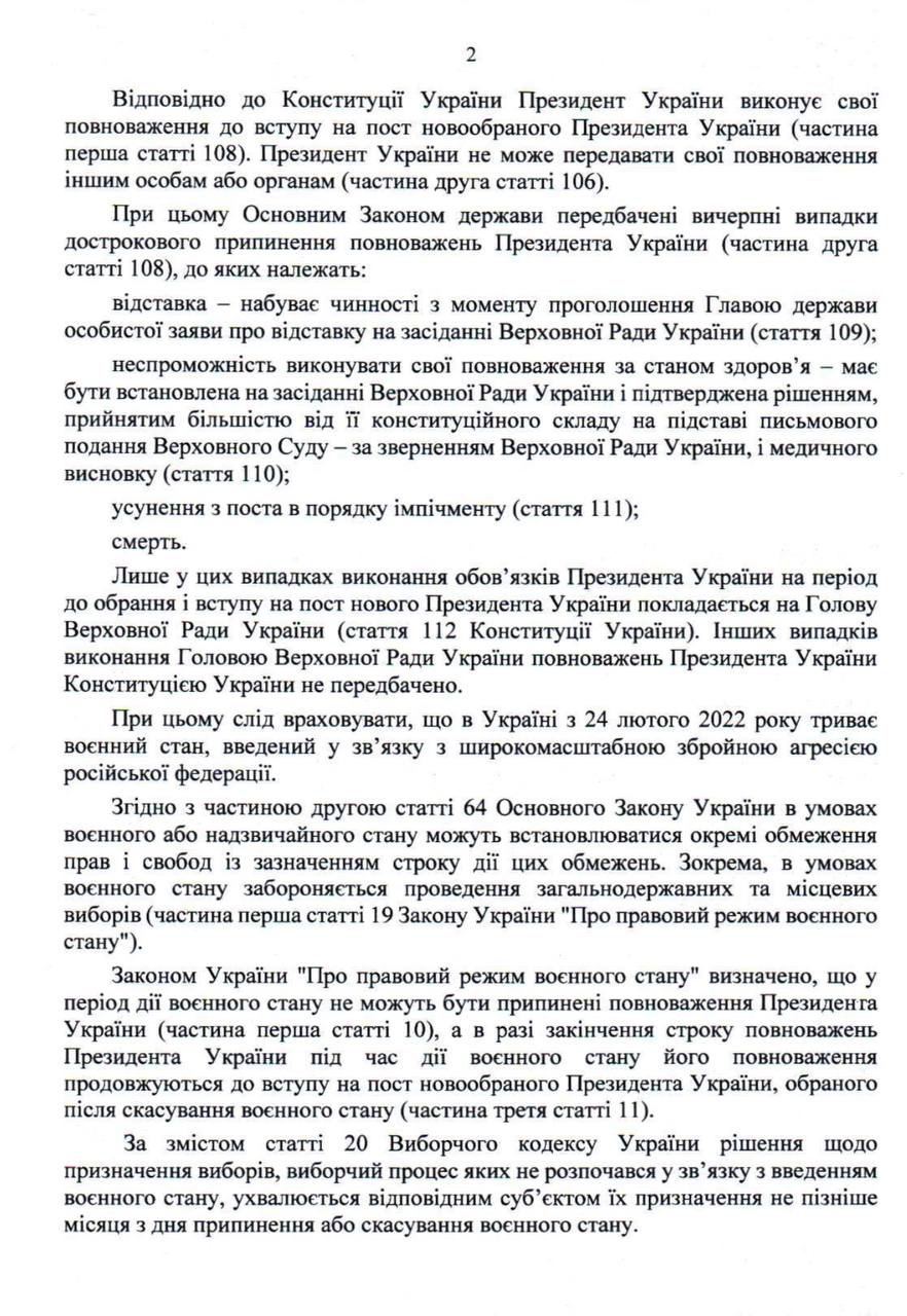 И в случае окончания срока полномочий президента они продолжаются до избрания нового президента после окончания военного положения. Выборы должны быть назначены Радой не позднее чем через месяц после окончания военного положения.