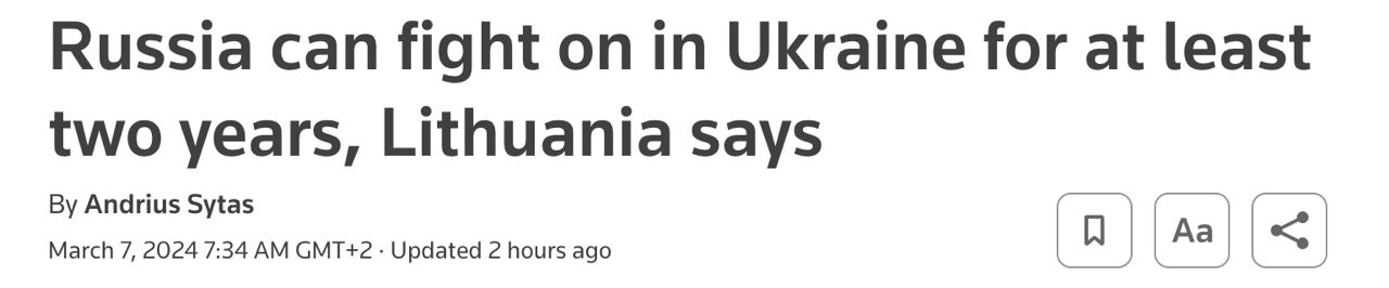 09.40 Россия сможет воевать с Украиной с нынешней интенсивностью еще как минимум два года, цитирует закрытый доклад литовских спецслужб Reuters.