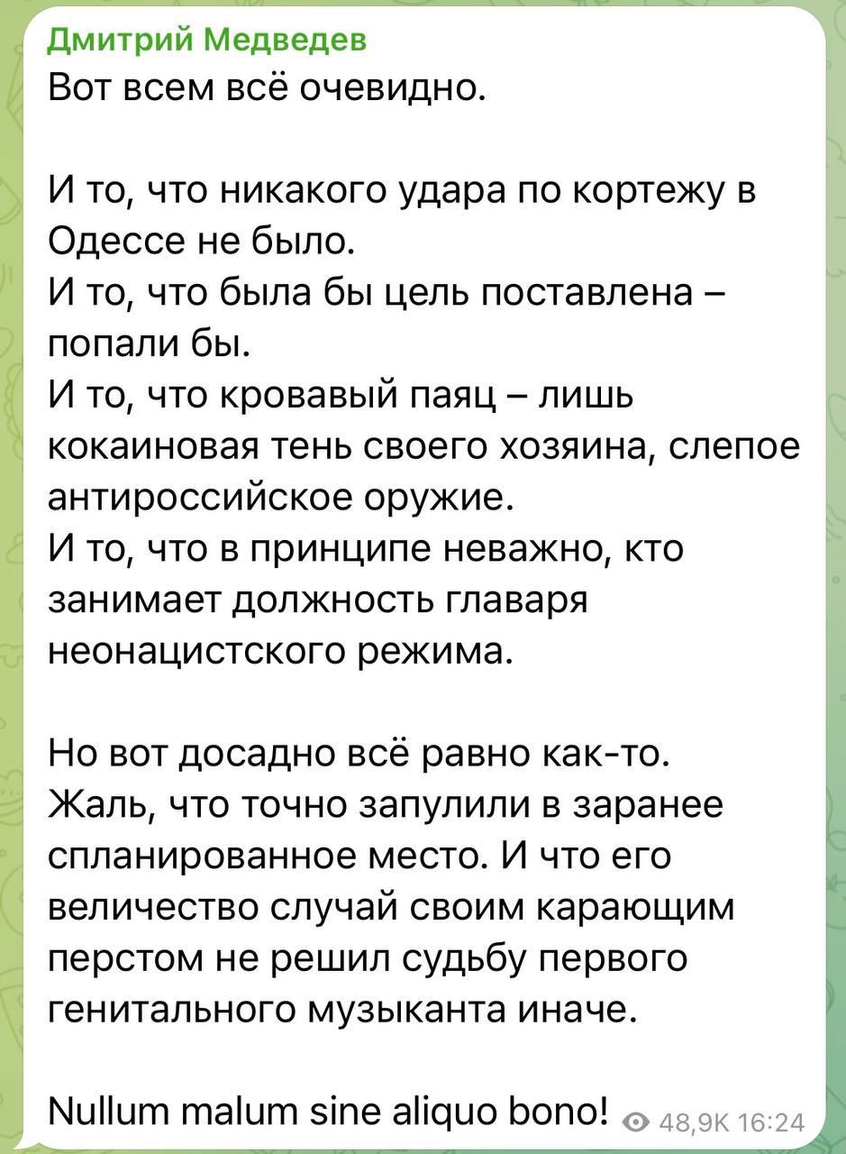 Заместитель председателя Совета безопасности России Дмитрий Медведев заявил, что ему "досадно", что российская ракета не попала вчера по Владимиру Зеленскому, когда тот был с визитом в Одессе.