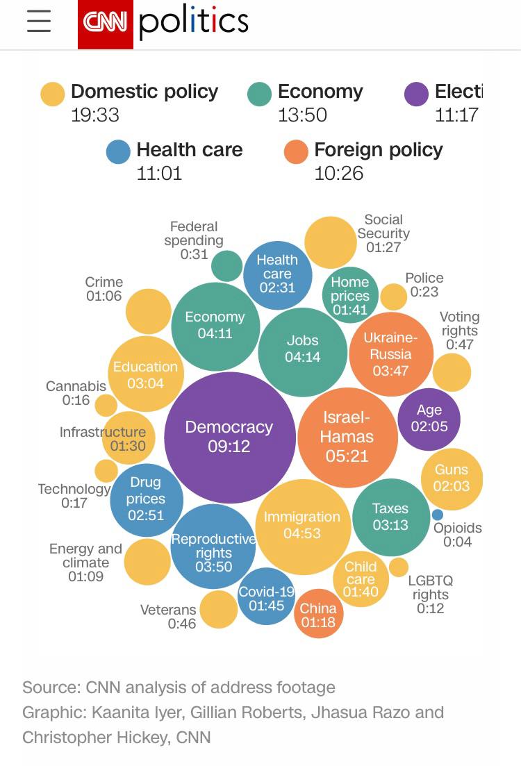 Как подсчитал телеканал CNN, куда больше времени президент США посвятил "демократии" (то есть, видимо, вопросам выборов), войне в секторе Газа, иммиграции, занятости и экономике. Даже вопрос о праве на аборты (reproductive rights) обошел по длительности тему Украины.