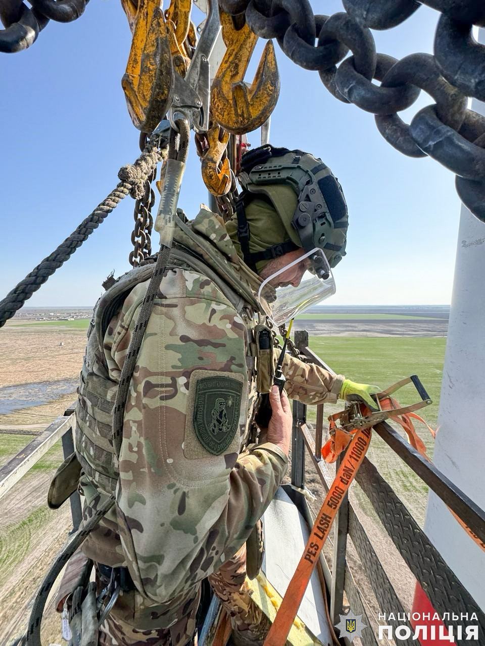 С помощью крана взрывотехники поднялись на высоту 55 метров, что эквивалентно 18-этажному дому. Затем они осторожно извлекли обломок беспилотника и спустили его вниз.