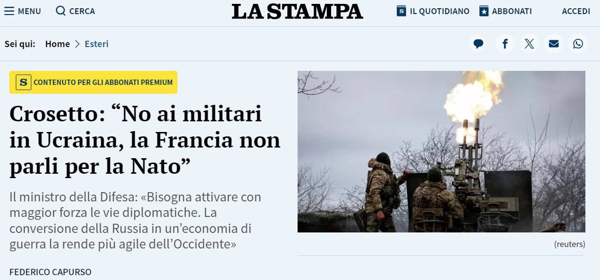 Министр обороны Италии Гвидо Крозетто раскритиковал заявления Франции и Польши о возможности отправки войск стран НАТО в Украину.