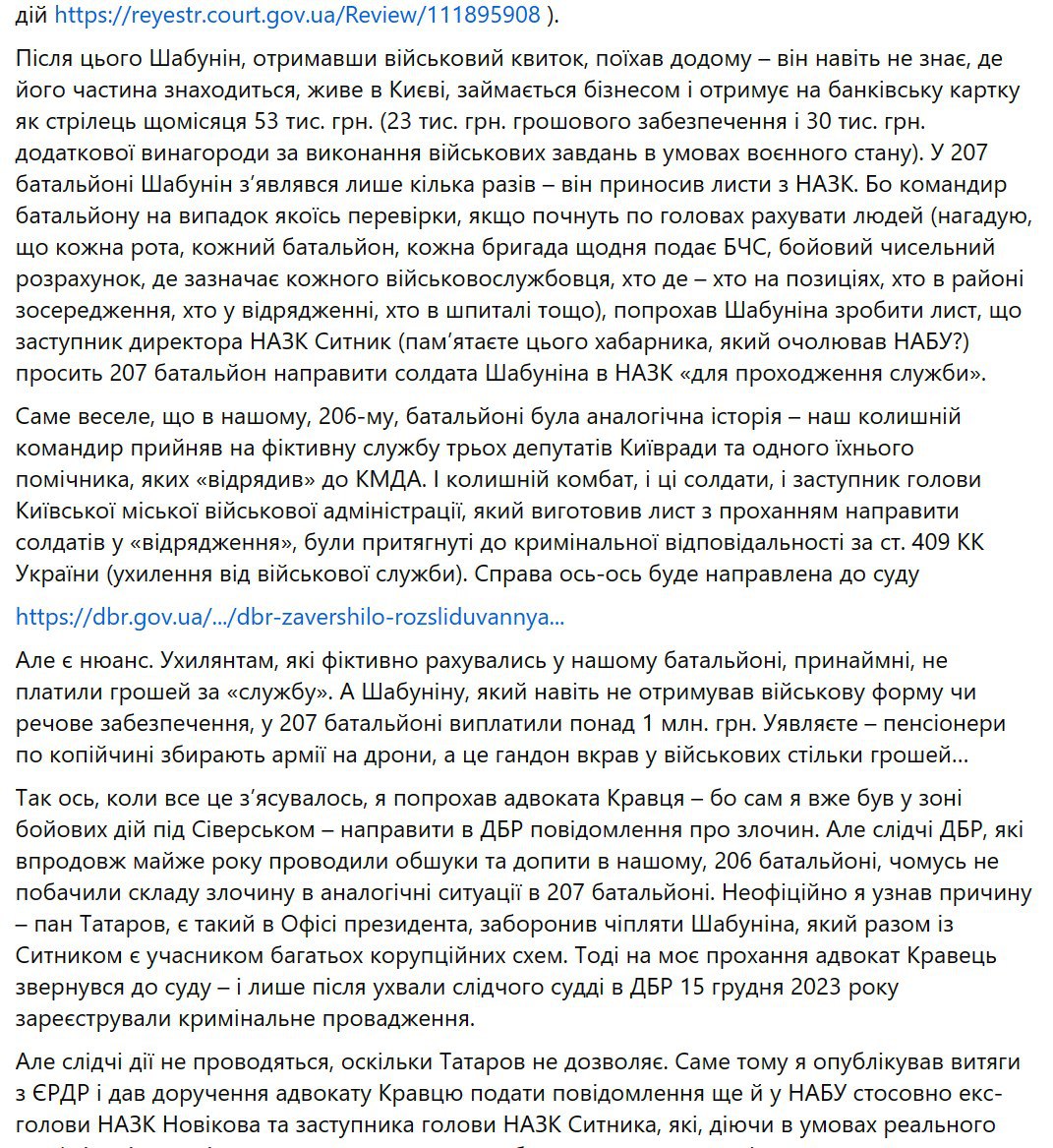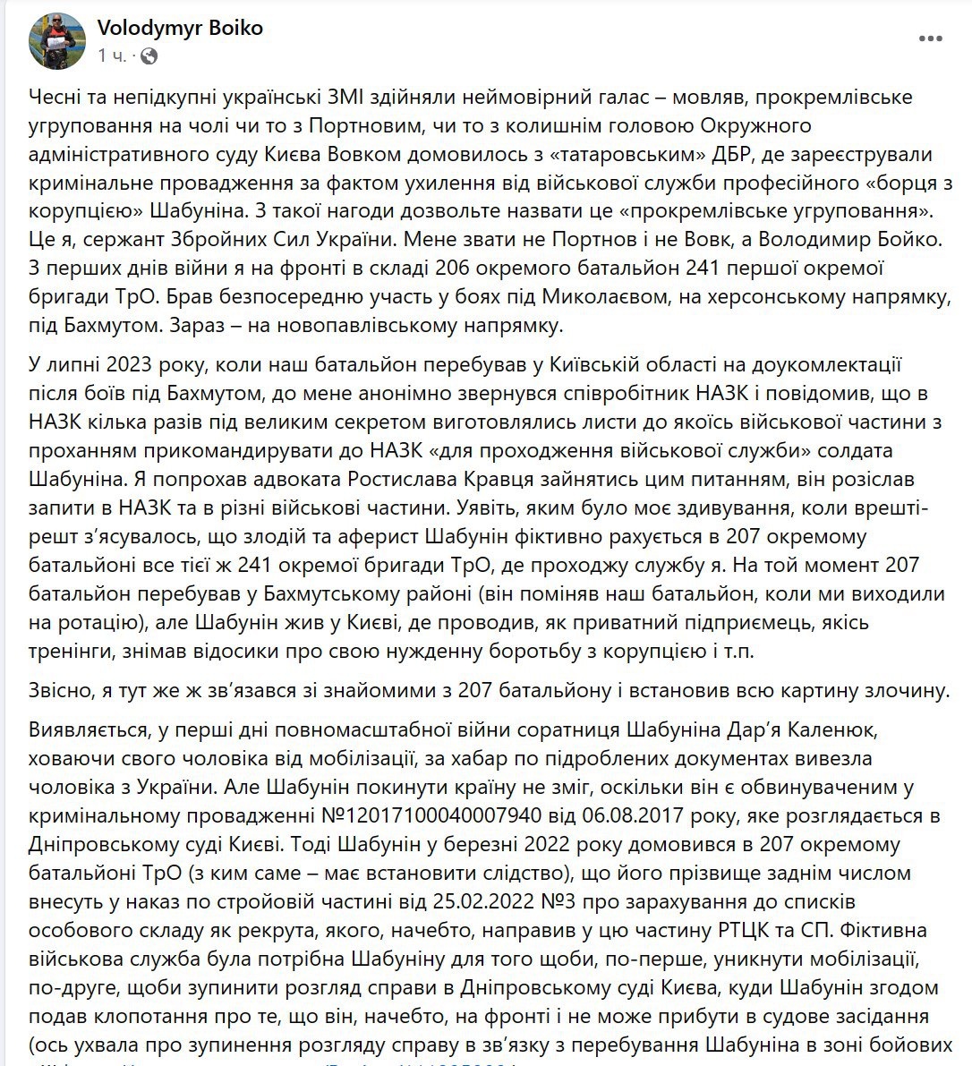 После рассылки официальных запросов выяснилось, что речь идет о 207-м отдельном батальоне 241-й отдельной бригады ТРО, в которой служит сам Бойко. По его словам, на время службы Шабунина указанный батальон находился под Бахмутом. Но сам антикоррупционер, по данным журналиста, "жил в Киеве, где проводил, как частный предприниматель, какие-то тренинги, снимал видосики о своей убогой борьбе с коррупцией".