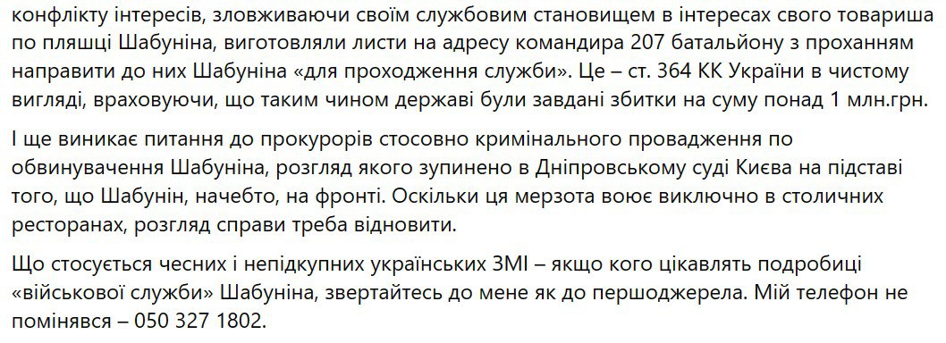По мнению журналиста, таким образом антикоррупционер смог освободиться от реальной мобилизации, а также остановить расследование против себя уголовного дела, тянущегося с 2017 года (Шабунин подал ходатайство, что на заседания из-за службы ходить не может).