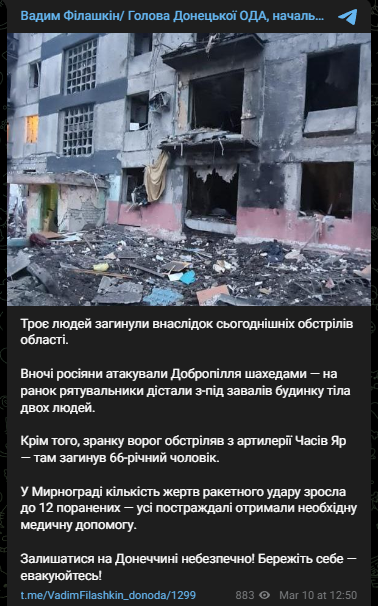 "Ночью россияне атаковали Доброполье "Шахедами" - к утру спасатели достали из-под завалов дома тела двух человек", - написал он.