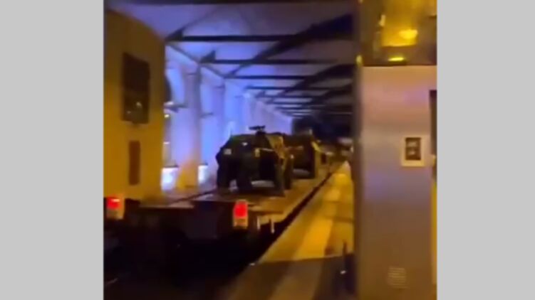 Например, в одном из роликов снят проезд эшелона с открытыми платформами, на которых перевозят тяжелую военную технику.