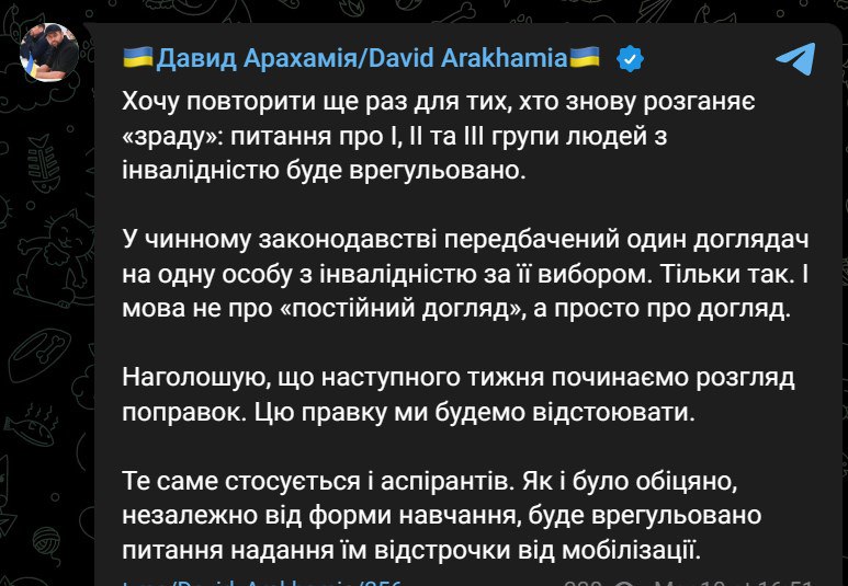 "Видимо, идет речь об отсрочке от мобилизации для лиц, которые ухаживают за инвалидами. В новом законопроекте планировалось ужесточить определение статуса такого лица. Но судя по словам Арахамии, своего попечителя сможет определять сам инвалид", - пишет телеграм-канал.