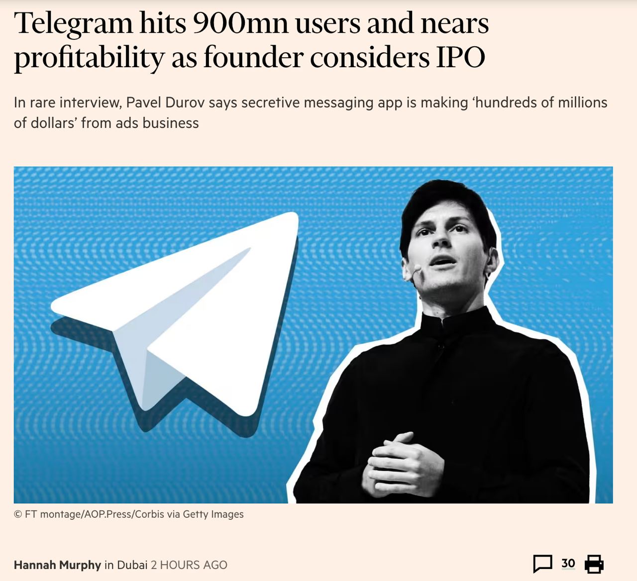 По словам Дурова, потенциальные инвесторы "предложили оценку Телеграма в 30 миллиардов долларов", включая "глобальные технологические фонды поздней стадии". Однако он исключил возможность продажи сервиса и пока изучает будущее первичное публичное размещение акций - IPO.