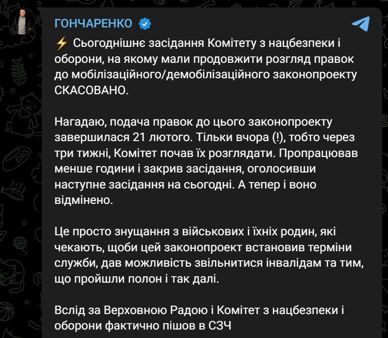 "Вслед за Верховной Радой и Комитет по нацбезопасности и обороне фактически ушел в СОЧ (Самовольное оставление части - Ред.)", - пишет Гончаренко.