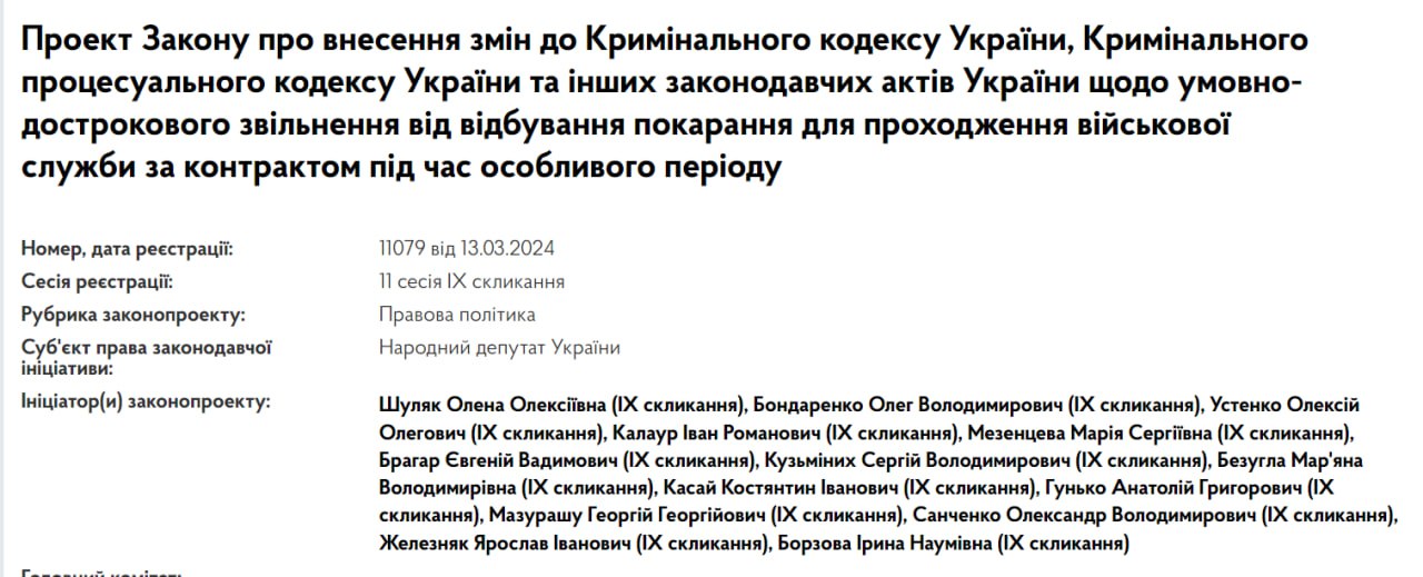 В Верховной Раде зарегистрирован законопроект, который предлагает предоставить условно-досрочное освобождение от отбывания наказания лицам для прохождения военной службы по контракту в особый период.