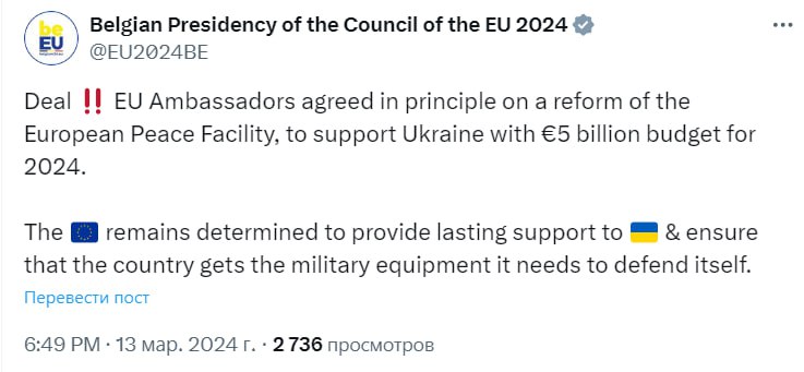 "Послы ЕС в принципе согласились на реформу Европейского фонда мира, чтобы поддержать Украину с 5-миллиардным бюджетом на 2024 год. ЕС по-прежнему решительно оказывает длительную поддержку Украине и гарантирует, что страна получит необходимое военное оборудование для защиты", – говорится в заявлении.
