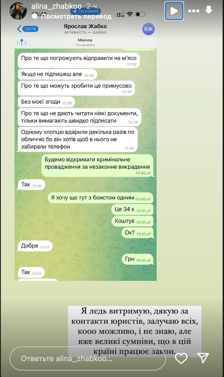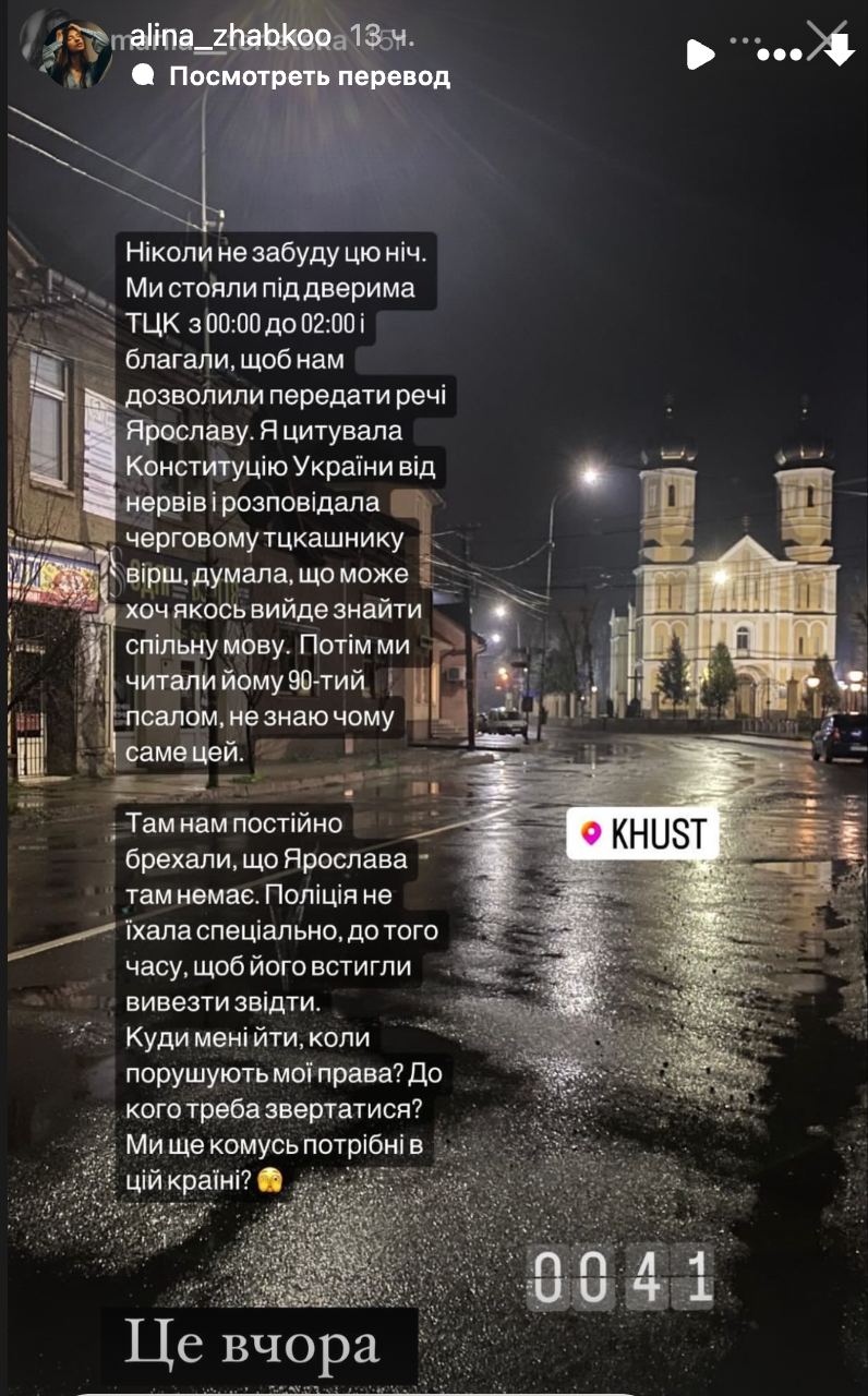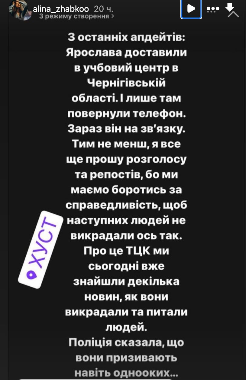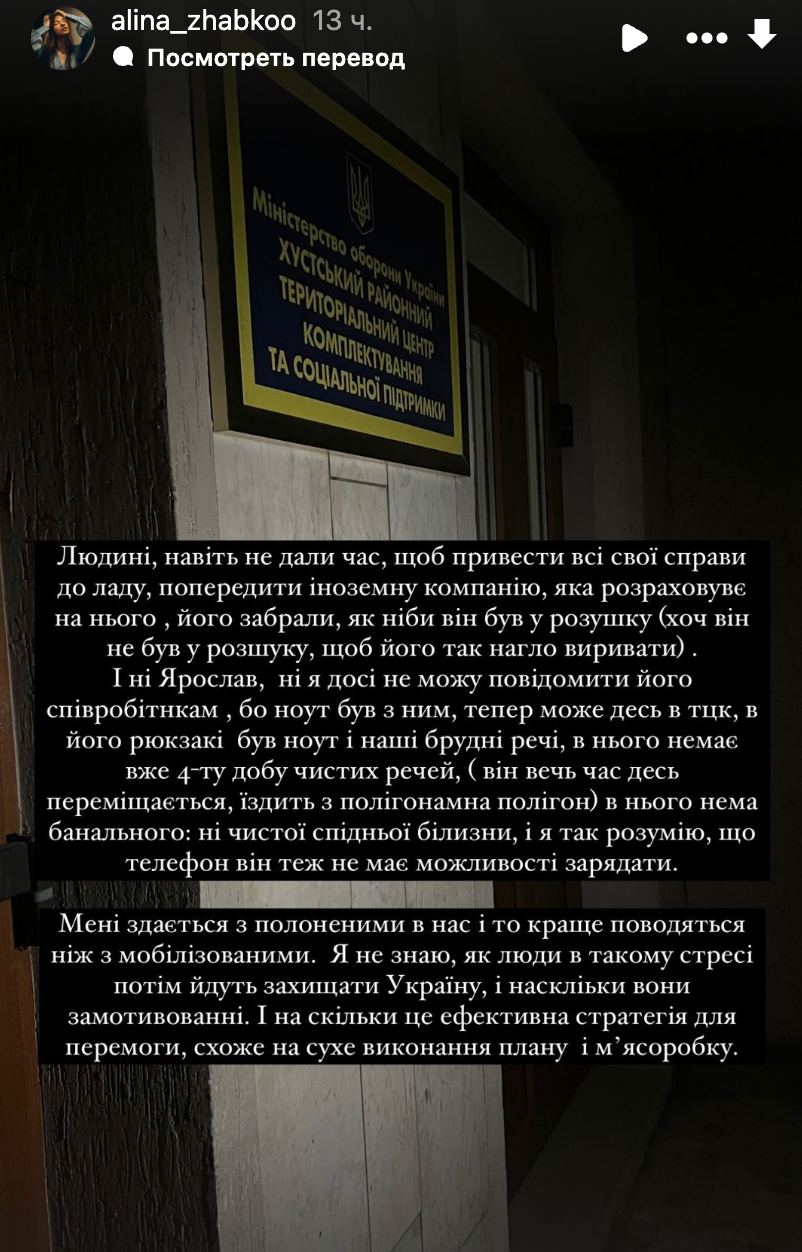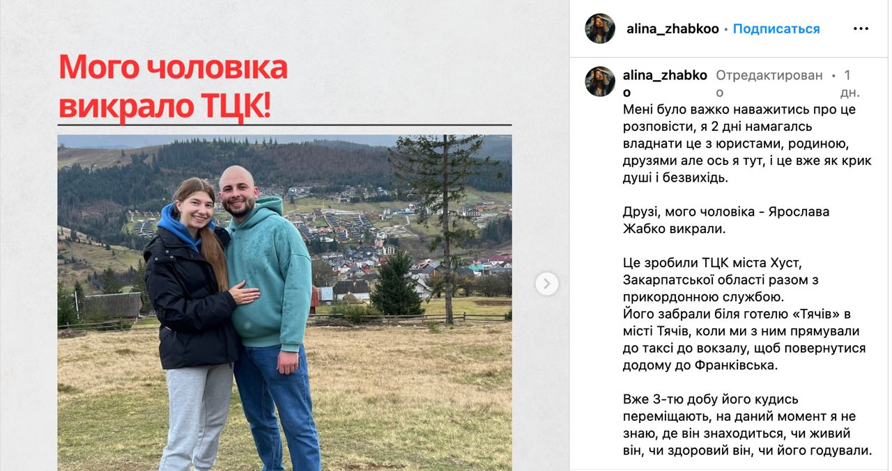 "Моего мужа Ярослава Жабко похитили. Это сделал ТЦК города Хуст Закарпатской области вместе с пограничной службой. Его забрали возле гостиницы "Тячев" в городе Тячев, когда мы с ним направлялись к такси до вокзала, чтобы вернуться домой во Франковск. Уже третьи сутки его куда-то перемещают, на данный момент я не знаю, где он находится, жив ли он, здоров ли он, кормили ли его. За эти трое суток я общалась с ним где-то три раза: от 30 секунд до 2 минут", - написала Алина.