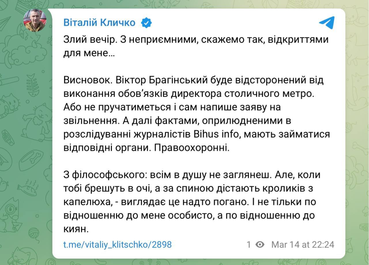 "Виктор Брагинский будет отстранен от исполнения обязанностей директора столичного метро. Или не будет сопротивляться и сам напишет заявление на увольнение. Далее фактами, обнародованными в расследовании журналистов Bihus.Info, должны заниматься соответствующие органы. Правоохранительные", - сказано в посте Кличко.