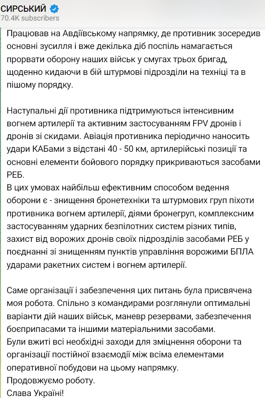 Армия РФ пытается прорвать оборону ВСУ. Сырский рассказал о ситуации на Авдеевском направлении
