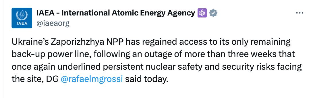 Также станция восстановила доступ к своей единственной оставшейся резервной линии электропередачи после более трех недель отключения.