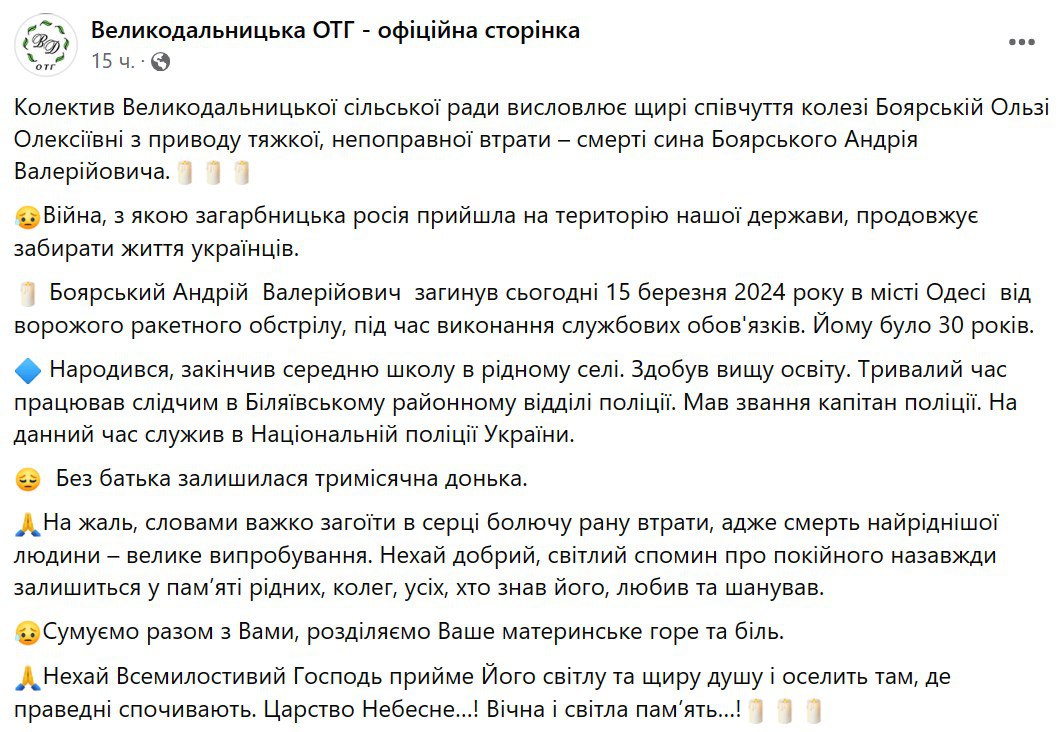 10:26 Во время вчерашнего удара по Одессе погиб еще один полицейский - 30-летний капитан Андрей Боярский.