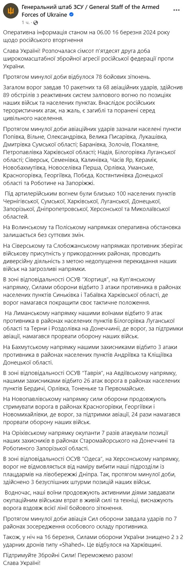 За прошедшие сутки произошло 78 боевых столкновений. Всего россияне нанесли 10 ракетных и 68 авиационных ударов, совершили 89 обстрелов из РСЗО по позициям наших войск и населенным пунктам.