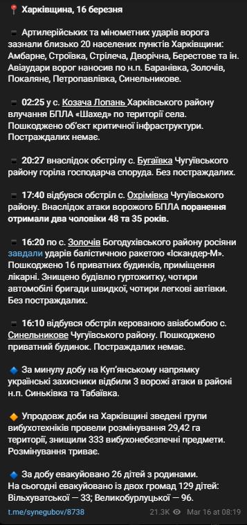 За последние сутки российские военные обстреляли 20 населенных пунктов Харьковской области. Использовались артиллерия, минометы, а также дроны, ракетные системы "Искандер-М" и авиабомбы.