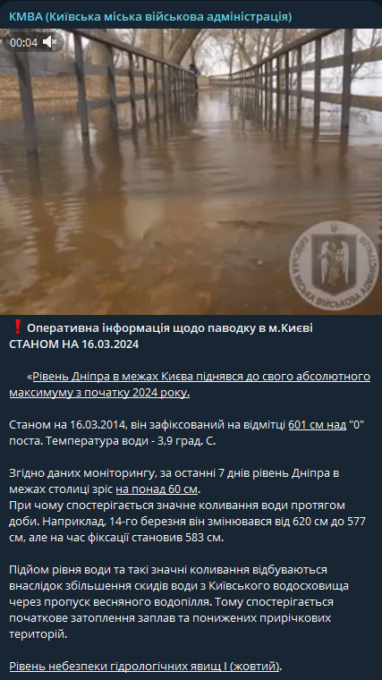 Ранее сообщалось, что в результате увеличения сбросов воды из Киевского водохранилища из-за весеннего половодья на реке Днепр в пределах Киева наблюдается повышение уровня воды, примерно на 6 см в сутки, с начальным затоплением поймы.
