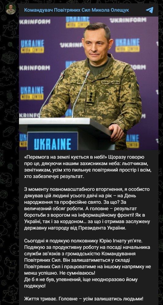 "Благодарю за продуктивную работу в должности начальника службы по связям с общественностью Командования Воздушных Сил. Игнат будет оставаться в составе Воздушных сил и будет работать на другом направлении не менее успешно", - заявил Олещук.
