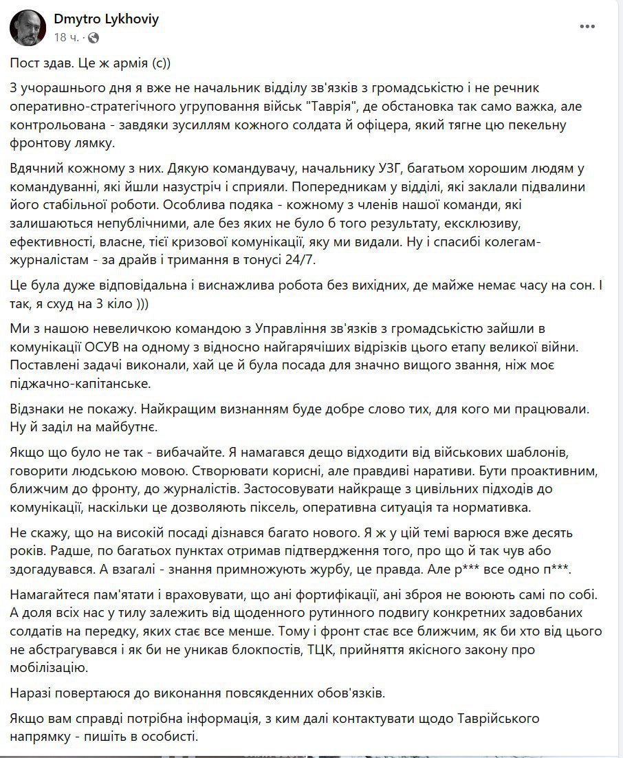 Со своего поста ушел спикер Сил обороны Таврического направления Дмитрий Лиховий. Об этом он написал сам на своей странице в Facebook.